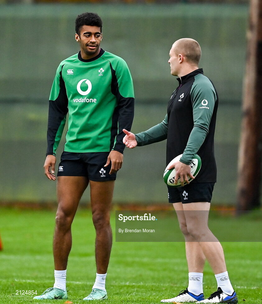 18 November 2021; Robert Baloucoune, left, with Keith Earls during Ireland rugby squad training at Carton House in Maynooth, Kildare. Photo by Brendan Moran/Sportsfile