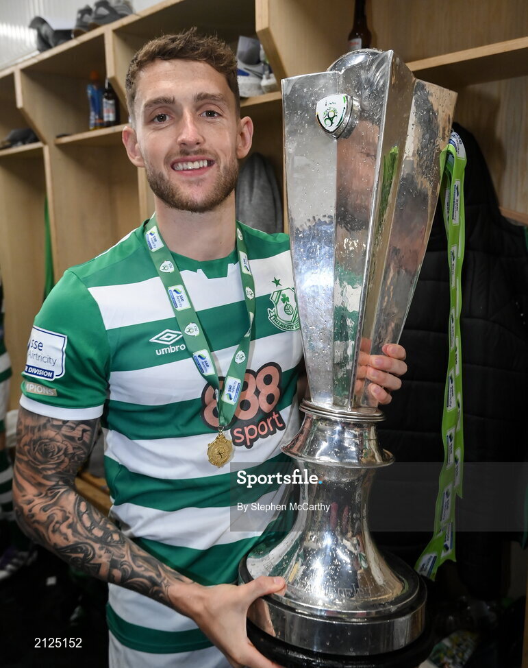 19 November 2021; Lee Grace of Shamrock Rovers celebrates with the SSE Airtricity League Premier Division trophy after their match against Drogheda United at Tallaght Stadium in Dublin. Photo by Stephen McCarthy/Sportsfile