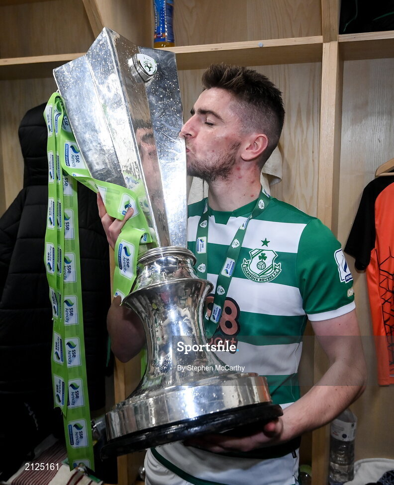 19 November 2021; Dylan Watts of Shamrock Rovers celebrates with the SSE Airtricity League Premier Division trophy after their match against Drogheda United at Tallaght Stadium in Dublin. Photo by Stephen McCarthy/Sportsfile