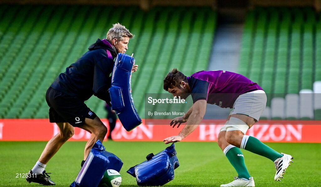 20 November 2021; Defence coach Simon Easterby, left, and Caelan Doris during the Ireland Captain's Run at Aviva Stadium in Dublin. Photo by Brendan Moran/Sportsfile