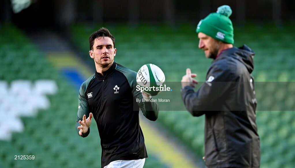 20 November 2021; Joey Carbery, left, takes a pass from assistant coach Mike Catt during the Ireland Captain's Run at Aviva Stadium in Dublin. Photo by Brendan Moran/Sportsfile