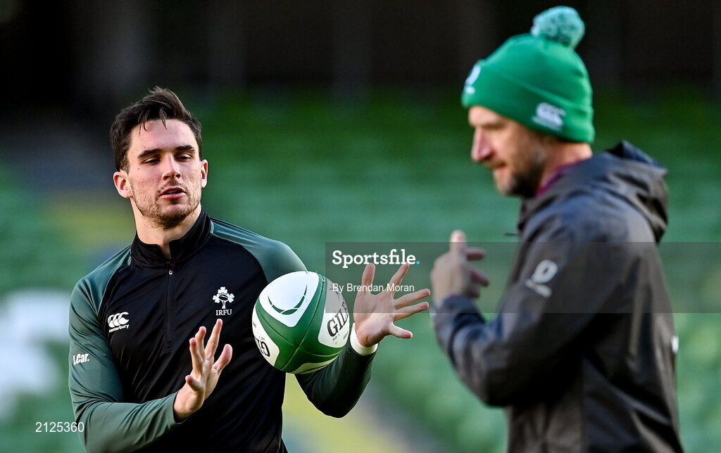 20 November 2021; Joey Carbery, left, takes a pass from assistant coach Mike Catt during the Ireland Captain's Run at Aviva Stadium in Dublin. Photo by Brendan Moran/Sportsfile