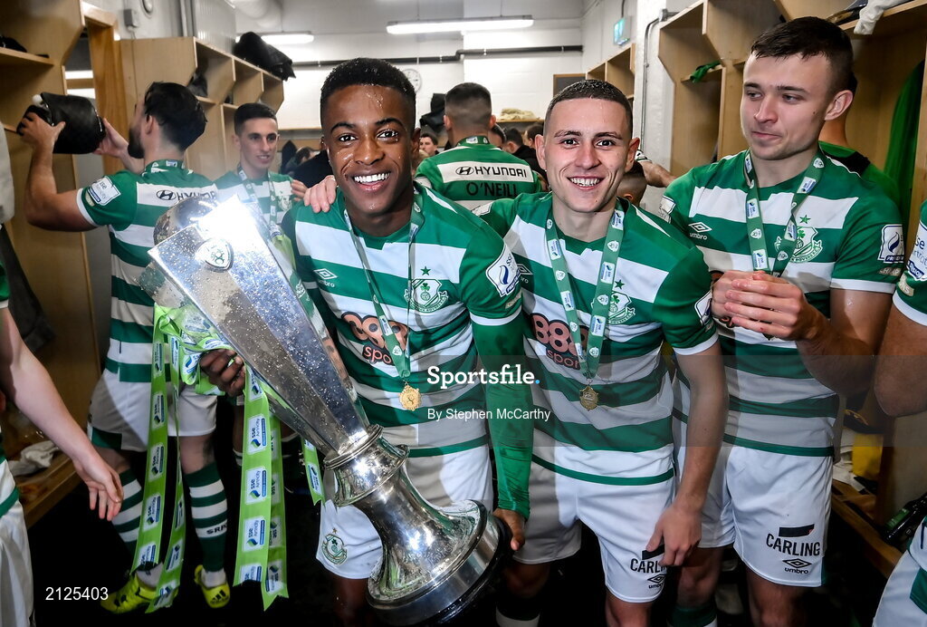19 November 2021; Aidomo Emakhu, left, and Max Murphy of Shamrock Rovers celebrate with the SSE Airtricity League Premier Division trophy after their match against Drogheda United at Tallaght Stadium in Dublin Photo by Stephen McCarthy/Sportsfile