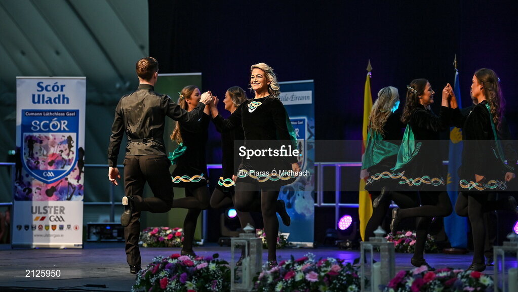 20 November 2021; The Watty Graham team, representing Derry and Ulster, of Laura McCloskey, Niamh McFalone, Caoimhe McLaughlin, Katie Strathern, Paul Gunning, Eunan Mulholland, Jack McGilligan and James McGilligan during the Rince Foirne competition at Scór Sinsir 2020 All-Ireland Finals at the Connacht GAA Air Dome in Bekan, Mayo. Photo by Piaras Ó Mídheach/Sportsfile