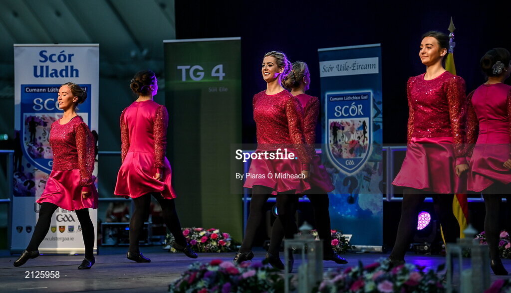 20 November 2021; An Caisleán Nua team, representing Tipperary and Munster, of Caelainn McGrath, Sinéad Grant, Eimear O'Connor, Veronica McNamara, Sarah English, Chloe Hennebry, Aoife Leahy and Kayleigh O'Brien during the Rince Foirne competition at Scór Sinsir 2020 All-Ireland Finals at the Connacht GAA Air Dome in Bekan, Mayo. Photo by Piaras Ó Mídheach/Sportsfile
