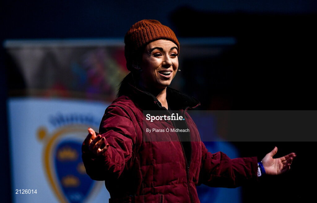20 November 2021; Sheila Naughton of Baile Coimín, representing Wicklow and Leinster, during the Aithriseoireacht/Scéalaíocht competition at Scór Sinsir 2020 All-Ireland Finals at the Connacht GAA Air Dome in Bekan, Mayo. Photo by Piaras Ó Mídheach/Sportsfile