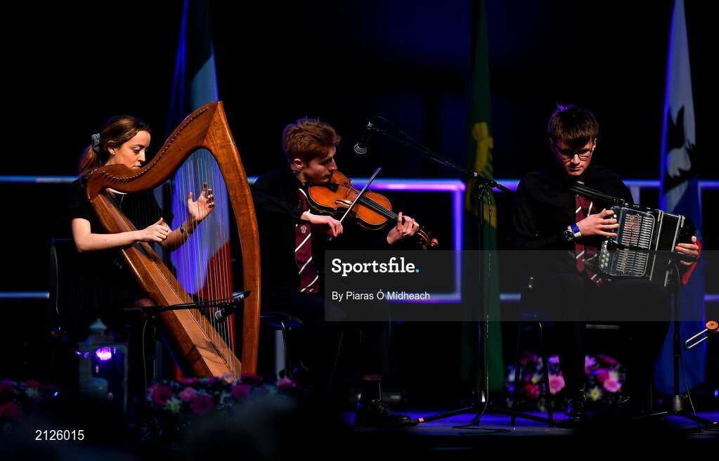 20 November 2021; The Cill Chábháin team, representing Laois and Leinster, of Sophie Ryan, Brian Ryan, Alain Carroll, Senan Moran and Noel Stapleton during the Ceol Uirlise competition at Scór Sinsir 2020 All-Ireland Finals at the Connacht GAA Air Dome in Bekan, Mayo. Photo by Piaras Ó Mídheach/Sportsfile