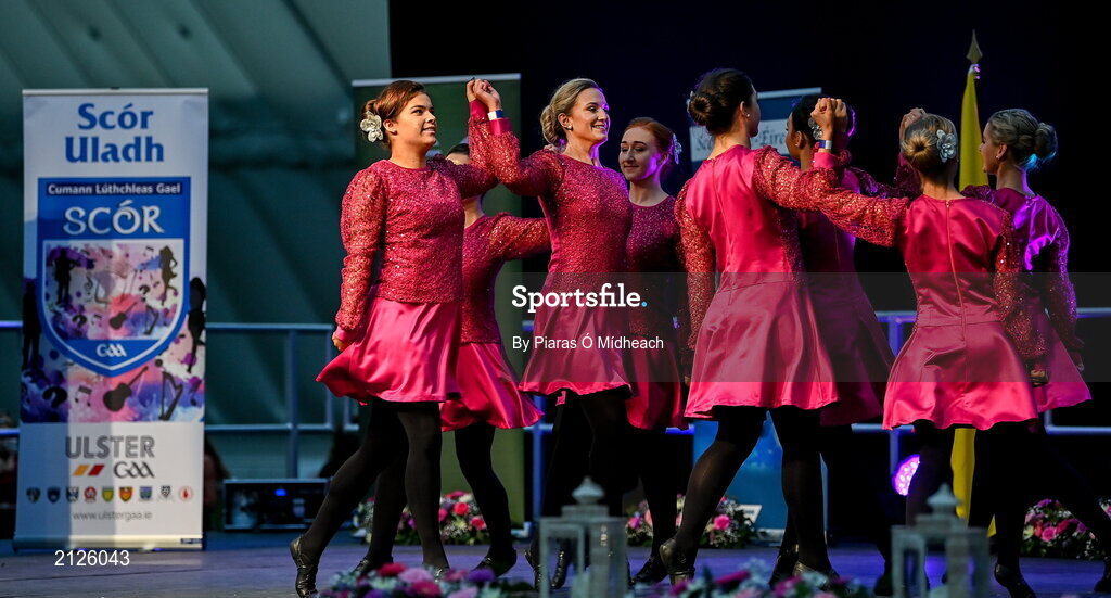 20 November 2021; An Caisleán Nua team, representing Tipperary and Munster, of Caelainn McGrath, Sinéad Grant, Eimear O'Connor, Veronica McNamara, Sarah English, Chloe Hennebry, Aoife Leahy and Kayleigh O'Brien during the Rince Foirne competition at Scór Sinsir 2020 All-Ireland Finals at the Connacht GAA Air Dome in Bekan, Mayo. Photo by Piaras Ó Mídheach/Sportsfile