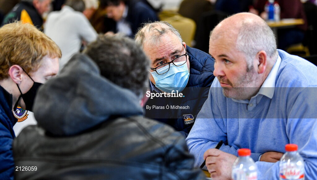 20 November 2021; The Ail Finn team, representing Roscommon, of Michael Gunn, Michael Rock, Colm Beirne and Mattie Hynes during Tráth na gCeist at the Scór Sinsir 2020 All-Ireland Finals at the Connacht GAA Air Dome in Bekan, Mayo. Photo by Piaras Ó Mídheach/Sportsfile
