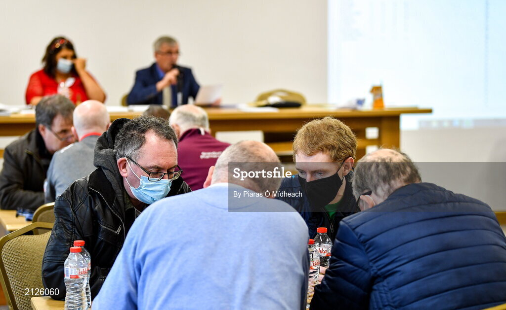 20 November 2021; The Ail Finn team, representing Roscommon, of Michael Gunn, Michael Rock, Colm Beirne and Mattie Hynes during Tráth na gCeist at the Scór Sinsir 2020 All-Ireland Finals at the Connacht GAA Air Dome in Bekan, Mayo. Photo by Piaras Ó Mídheach/Sportsfile