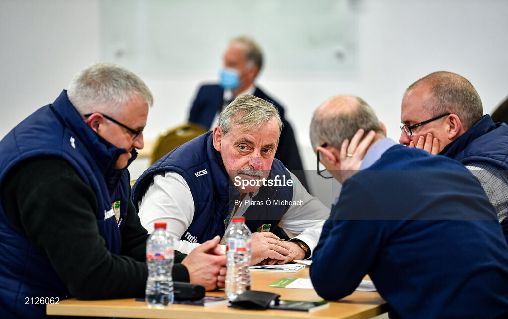 20 November 2021; The Edenderry team, representing Offaly, of Garrett Reilly, Ian Delamere, Peter Guing and Hugh O'Donoghue during Tráth na gCeist at the Scór Sinsir 2020 All-Ireland Finals at the Connacht GAA Air Dome in Bekan, Mayo. Photo by Piaras Ó Mídheach/Sportsfile