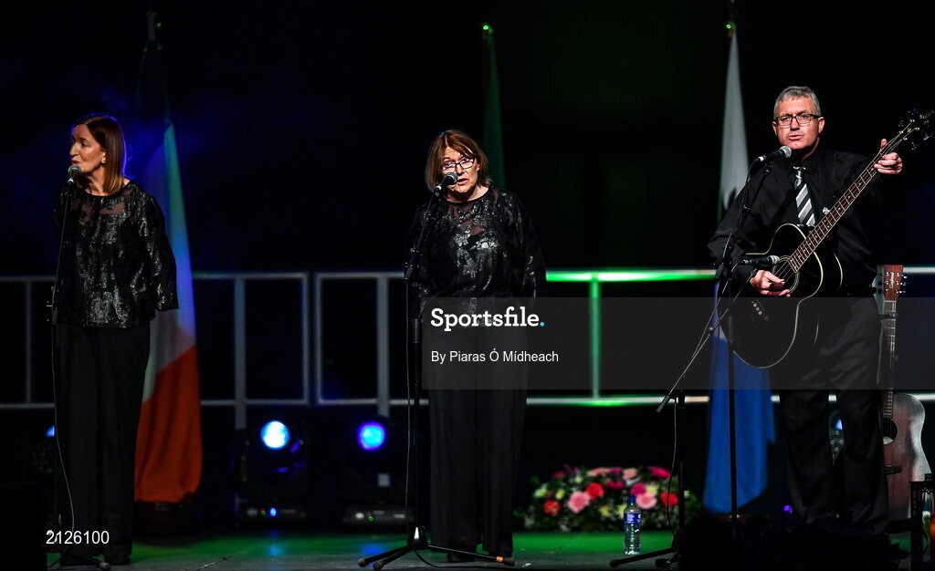 20 November 2021; The Naomh Dominic team, representing Roscommon and Connacht, of Noel Dervan, Cathy Dervan, Anita O'Keeffe, Mary Kenny and Sylvia Kilcline during the Bailéad-Ghrúpa competition at the Scór Sinsir 2020 All-Ireland Finals at the Connacht GAA Air Dome in Bekan, Mayo. Photo by Piaras Ó Mídheach/Sportsfile