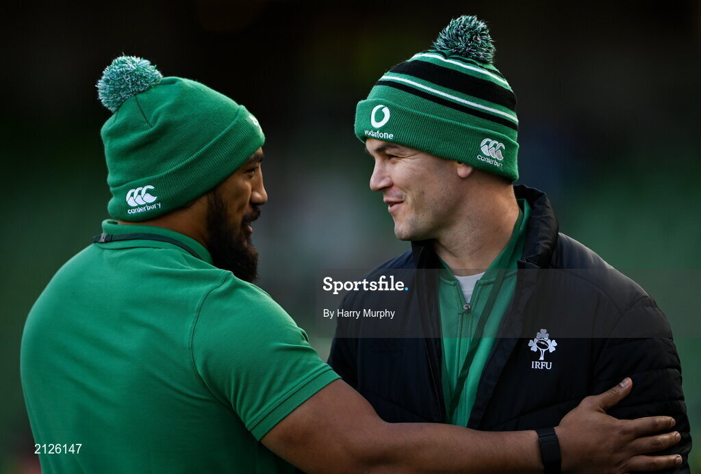 21 November 2021; Jonathan Sexton and Bundee Aki of Ireland before the Autumn Nations Series match between Ireland and Argentina at Aviva Stadium in Dublin. Photo by Harry Murphy/Sportsfile