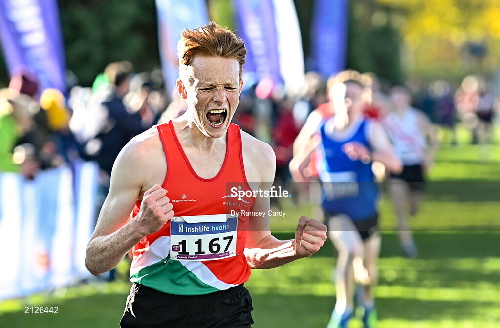 21 November 2021; Padraig Corduff of Westport AC, Mayo, celebrates a third place finish in the Boys U16 event during the Irish Life Health National Cross Country Championships at Santry Demense in Dublin. Photo by Ramsey Cardy/Sportsfile