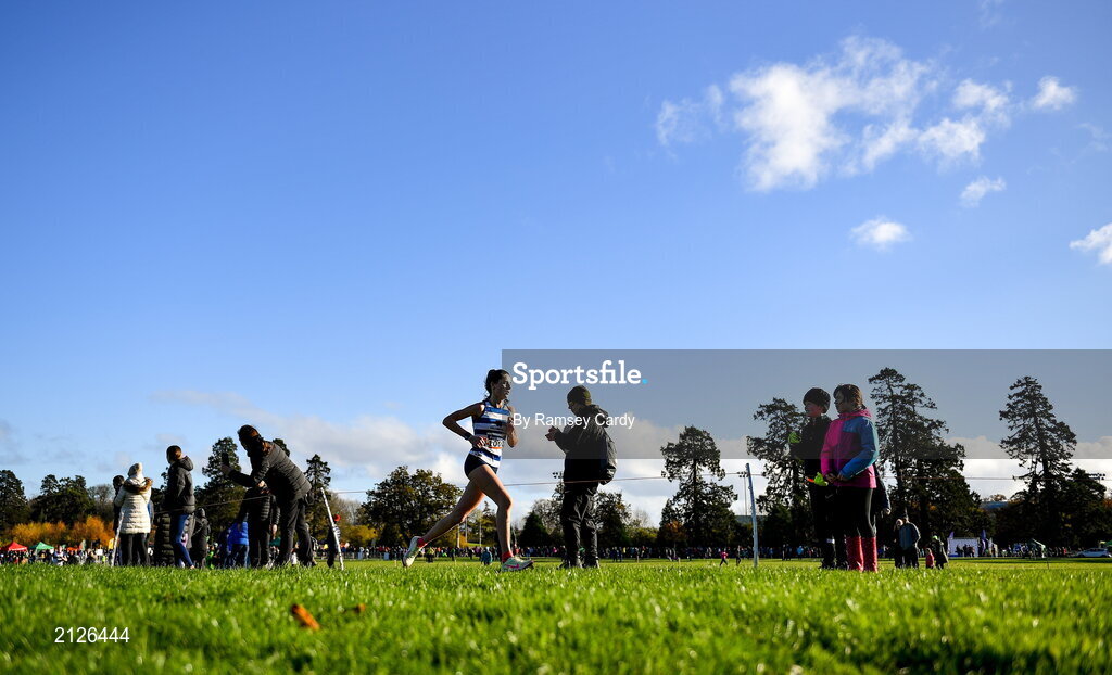 21 November 2021; Lucy Foster of Willowfield Harriers, Down, on her wy to winning the Girls U16 event during the Irish Life Health National Cross Country Championships at Santry Demense in Dublin. Photo by Ramsey Cardy/Sportsfile