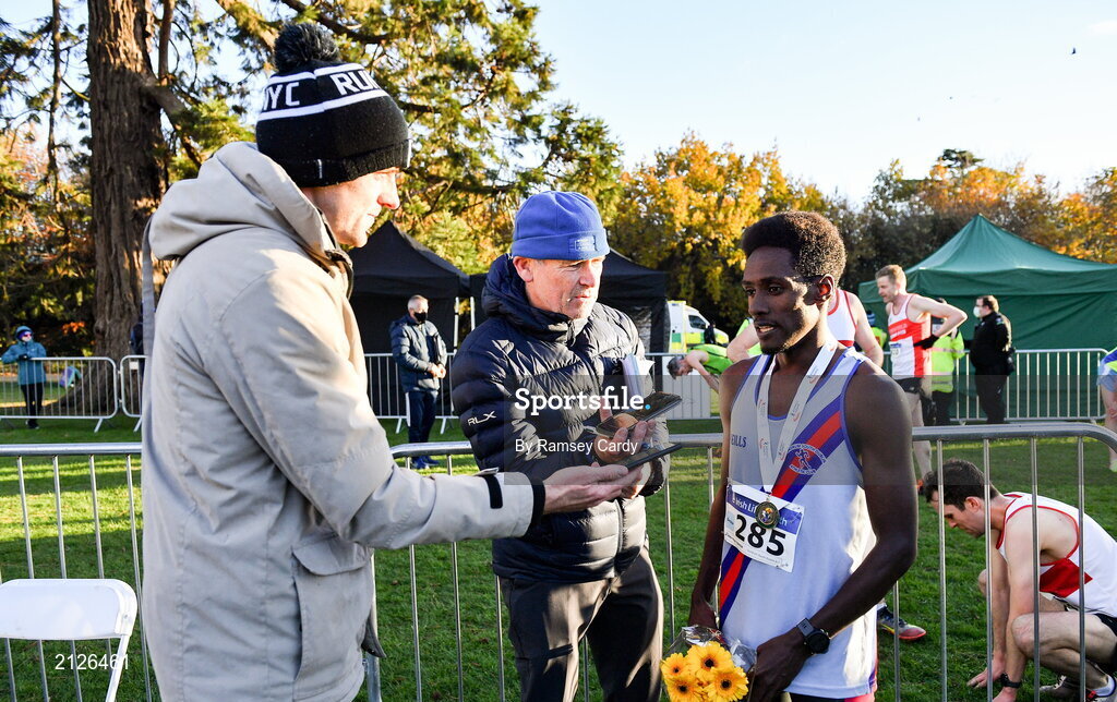21 November 2021; Senior Men's race winner Hiko Tonosa of Dundrum South Dublin AC, Dublin, is interviewed by journalists Cathal Dennehy, left, and Greg Allen of RTE during the Irish Life Health National Cross Country Championships at Santry Demense in Dublin. Photo by Ramsey Cardy/Sportsfile