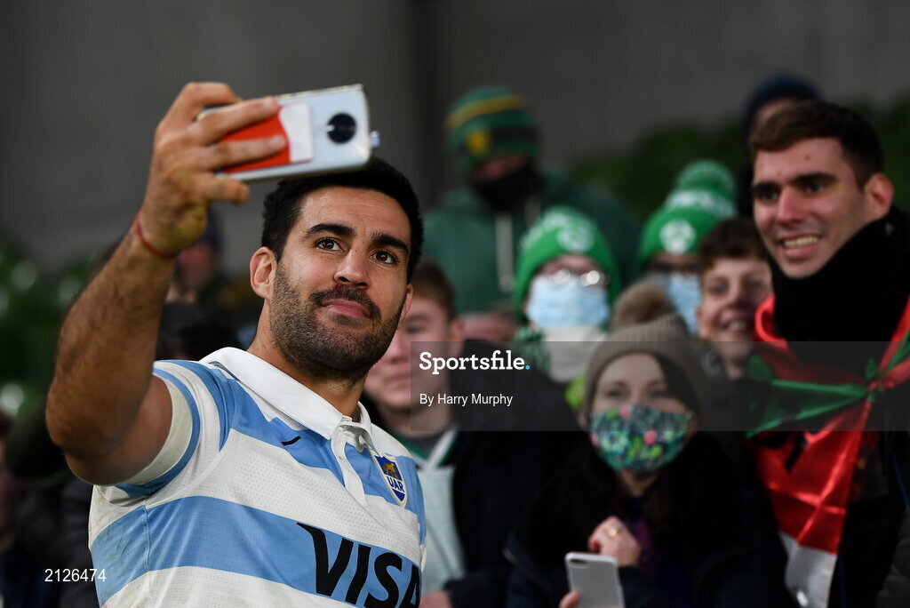 21 November 2021; Jeronimo De La Fuente of Argentina takes a selfie with supporters after the Autumn Nations Series match between Ireland and Argentina at Aviva Stadium in Dublin. Photo by Harry Murphy/Sportsfile