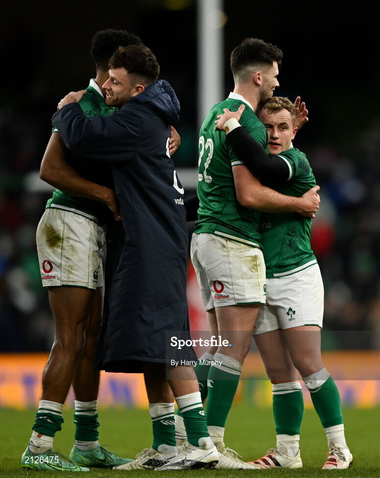 21 November 2021; Ireland players, from right, Craig Casey, Harry Byrne, Hugo Keenan and Robert Baloucoune embrace after their side's victory in the Autumn Nations Series match between Ireland and Argentina at Aviva Stadium in Dublin. Photo by Harry Murphy/Sportsfile