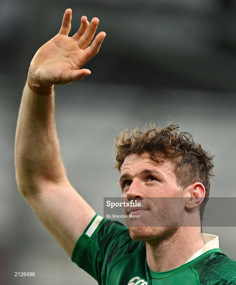 21 November 2021; Ryan Baird of Ireland wales to supporters after the Autumn Nations Series match between Ireland and Argentina at Aviva Stadium in Dublin. Photo by Brendan Moran/Sportsfile
