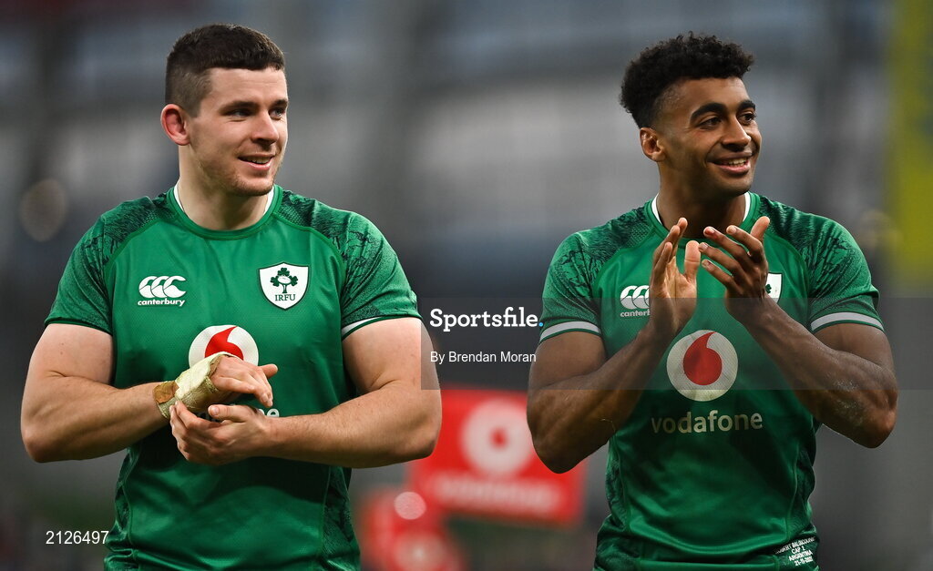 21 November 2021; Nick Timoney, left, and Robert Baloucoune of Ireland after the Autumn Nations Series match between Ireland and Argentina at Aviva Stadium in Dublin. Photo by Brendan Moran/Sportsfile