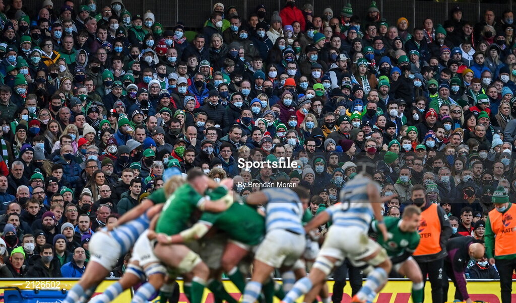 21 November 2021; Supporters wearing masks in the stand during the Autumn Nations Series match between Ireland and Argentina at Aviva Stadium in Dublin. Photo by Brendan Moran/Sportsfile