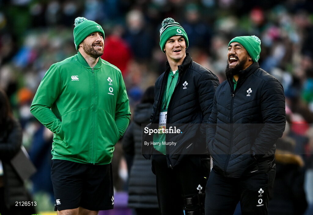 21 November 2021; Ireland players, from left, Jack Conan, Jonathan Sexton and Bundee Aki during the Autumn Nations Series match between Ireland and Argentina at Aviva Stadium in Dublin. Photo by Harry Murphy/Sportsfile