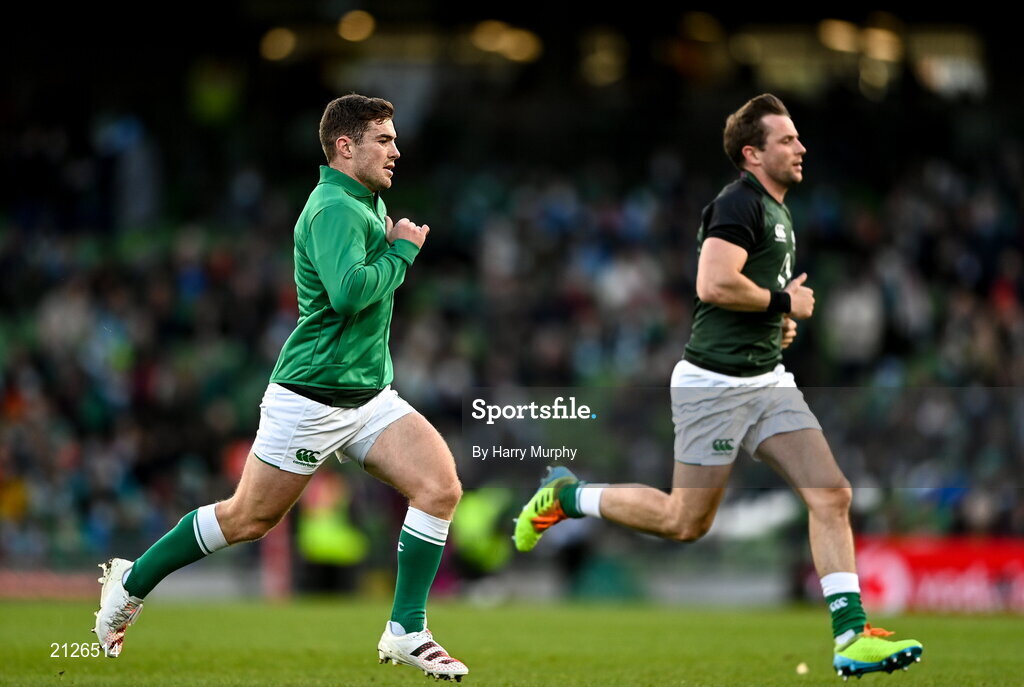 21 November 2021; Luke McGrath, left, and Jack Carty of Ireland warm-up before the Autumn Nations Series match between Ireland and Argentina at Aviva Stadium in Dublin. Photo by Harry Murphy/Sportsfile