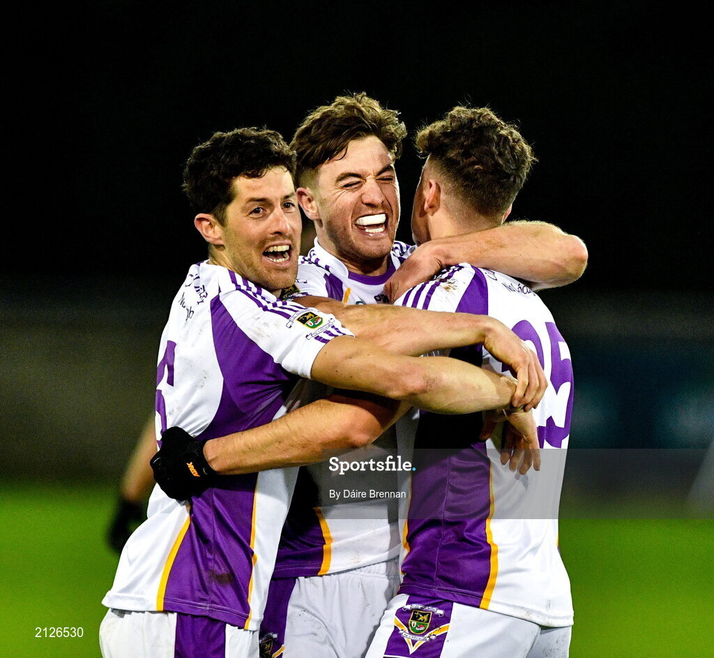 21 November 2021; Kilmacud Crokes' players, left to right, Rory O'Carroll, Andrew McGowan, and Conor Casey celebrate after the Go Ahead Dublin County Senior Club Football Championship Final match between St Jude's and Kilmacud Crokes at Parnell Park in Dublin. Photo by Daire Brennan/Sportsfile