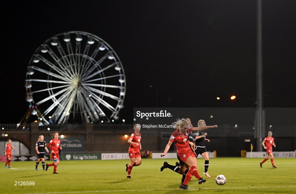 21 November 2021; Saoirse Noonan of Shelbourne has a shot on goal during the 2021 EVOKE.ie FAI Women's Cup Final between Wexford Youths and Shelbourne at Tallaght Stadium in Dublin. Photo by Stephen McCarthy/Sportsfile