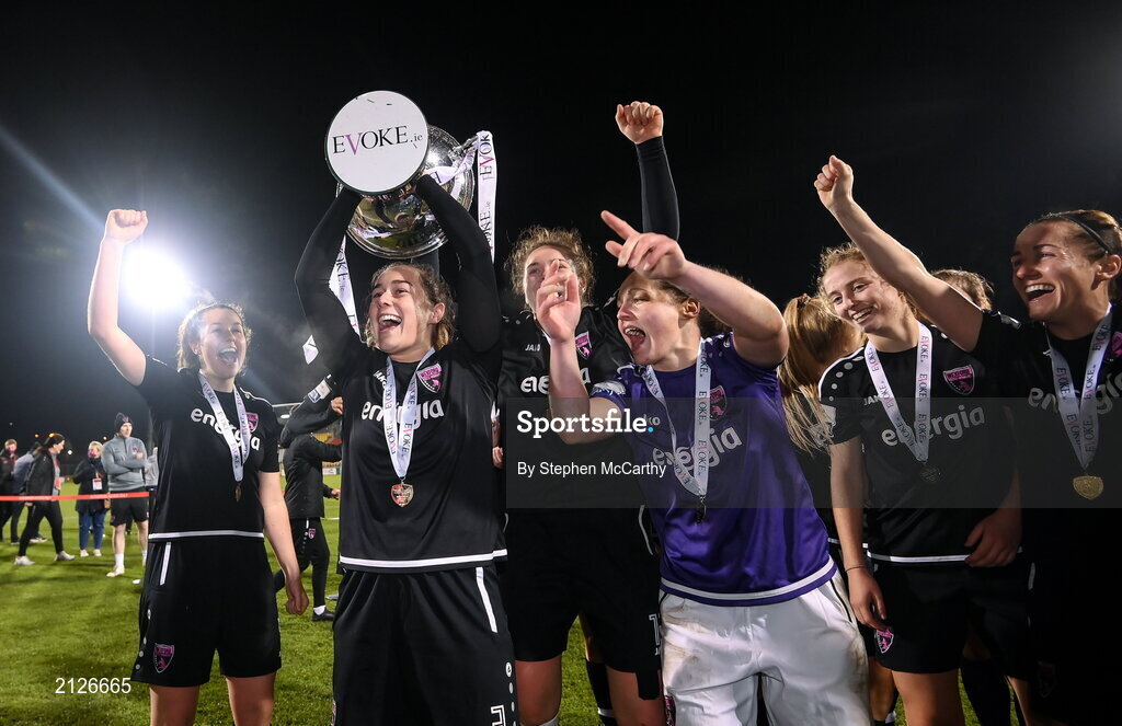 21 November 2021; Orlaith Conlon of Wexford Youths and team-mates celebrate with the cup following the 2021 EVOKE.ie FAI Women's Cup Final between Wexford Youths and Shelbourne at Tallaght Stadium in Dublin. Photo by Stephen McCarthy/Sportsfile