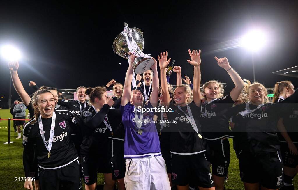 21 November 2021; Wexford Youths players celebrate with the cup following the 2021 EVOKE.ie FAI Women's Cup Final between Wexford Youths and Shelbourne at Tallaght Stadium in Dublin. Photo by Stephen McCarthy/Sportsfile
