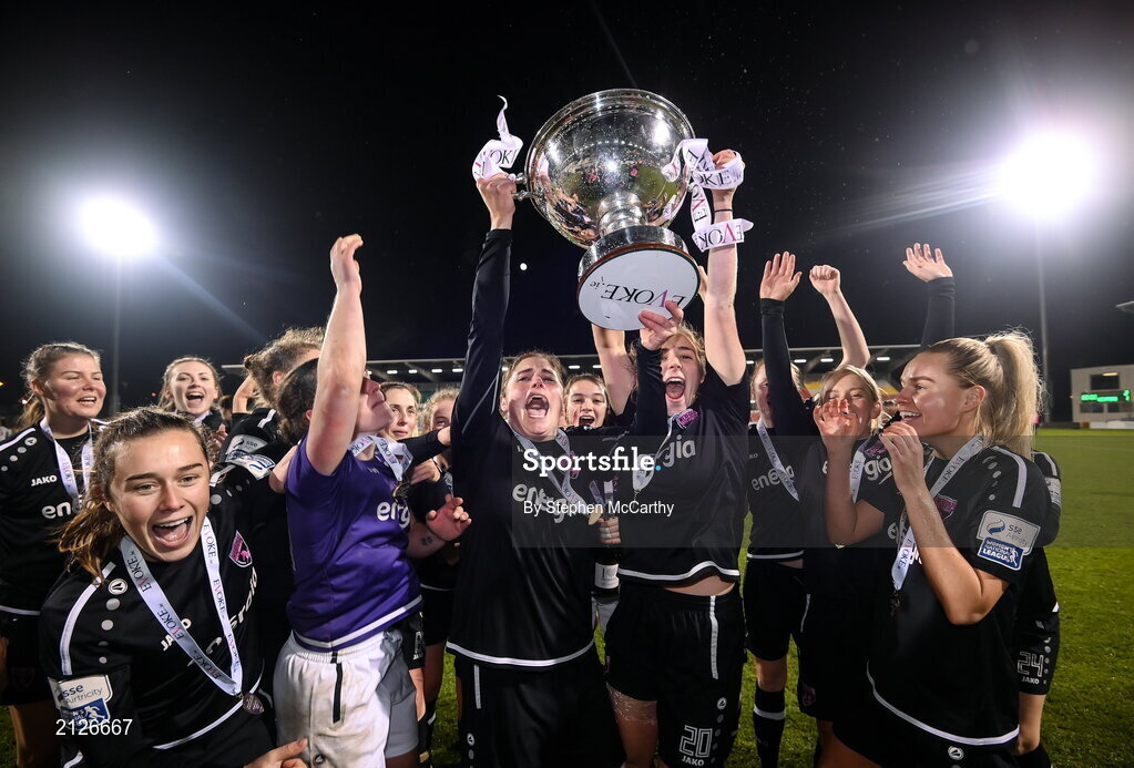 21 November 2021; Wexford Youths players celebrate with the cup following the 2021 EVOKE.ie FAI Women's Cup Final between Wexford Youths and Shelbourne at Tallaght Stadium in Dublin. Photo by Stephen McCarthy/Sportsfile