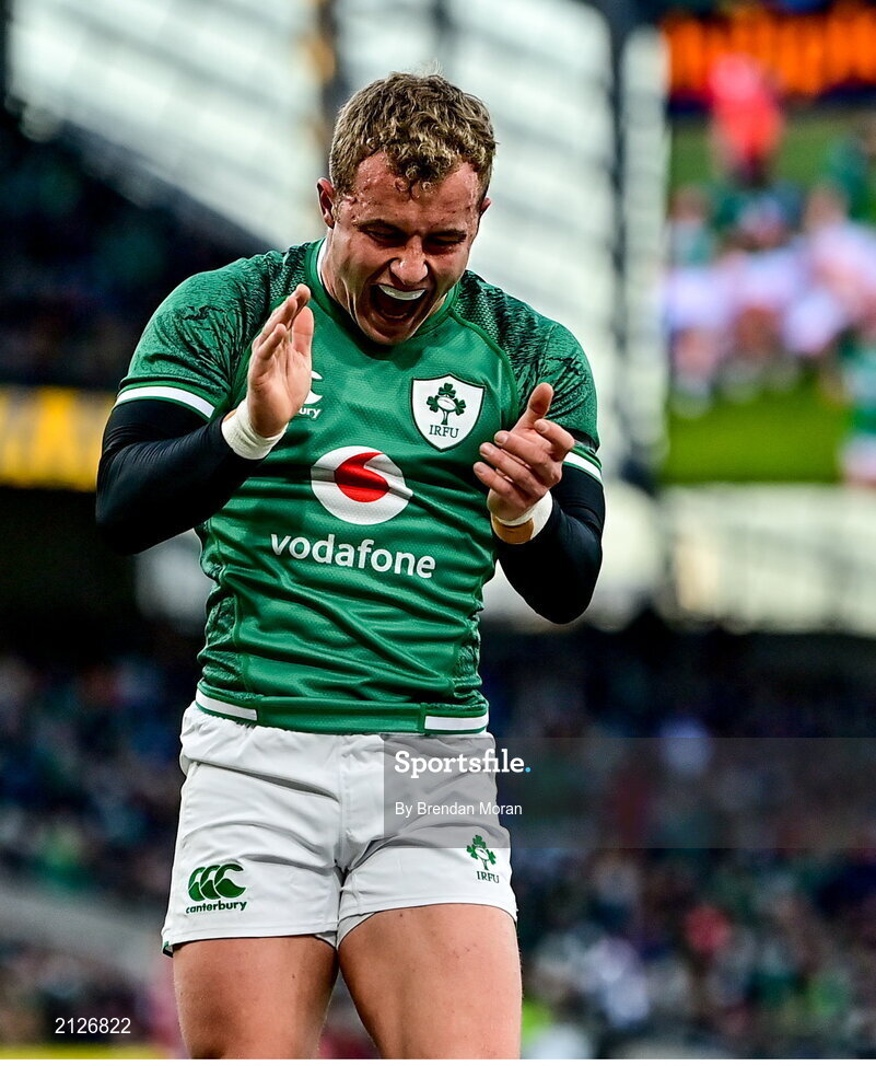 21 November 2021; Craig Casey of Ireland celebrates a try by team-mate Dan Sheehan during the Autumn Nations Series match between Ireland and Argentina at Aviva Stadium in Dublin. Photo by Brendan Moran/Sportsfile
