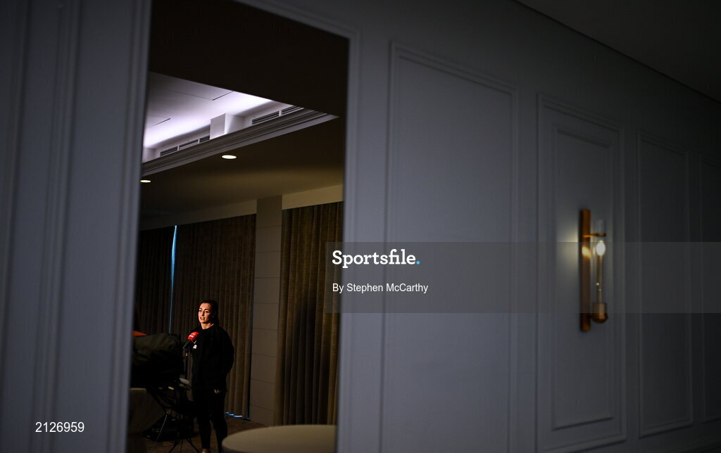 22 November 2021; Roma McLaughlin speaks to Virgin Media Television during a Republic of Ireland Women media day at Castleknock Hotel in Dublin. Photo by Stephen McCarthy/Sportsfile