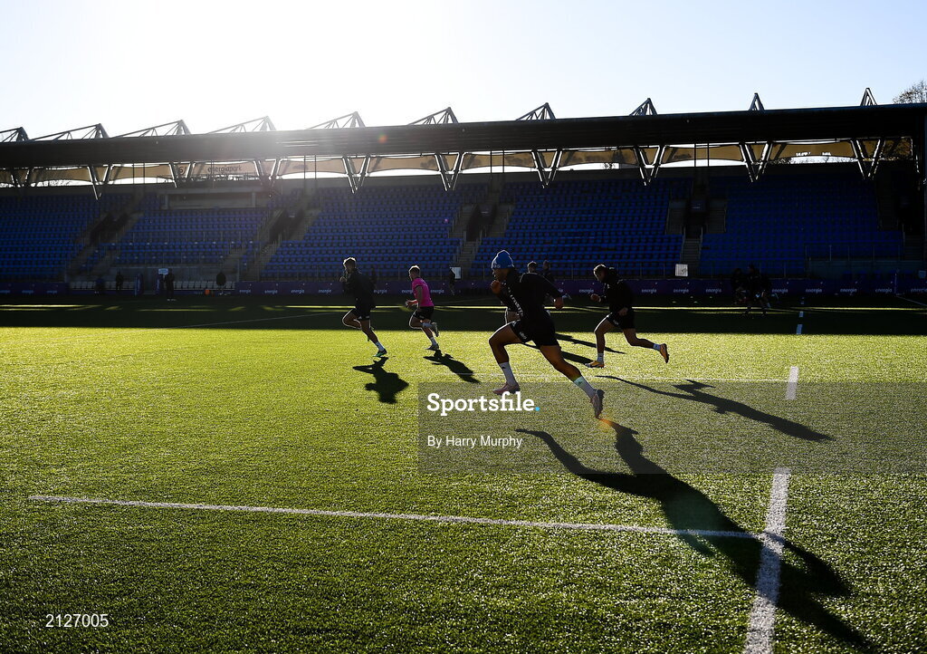 22 November 2021; Adam Byrne and team-mates warm-up during a Leinster Rugby squad training at Energia Park in Dublin. Photo by Harry Murphy/Sportsfile
