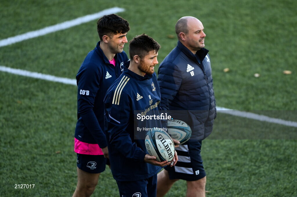 22 November 2021; Ross Byrne, centre, with Jimmy O'Brien and Kicking coach and head analyst Emmet Farrell during a Leinster Rugby squad training at Energia Park in Dublin. Photo by Harry Murphy/Sportsfile