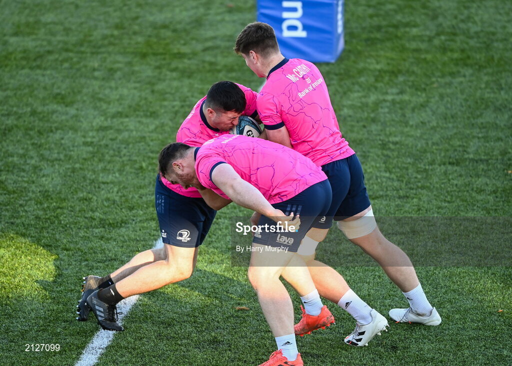 22 November 2021; Thomas Clarkson, left, with Peter Dooley and Joe McCarthy during a Leinster Rugby squad training at Energia Park in Dublin. Photo by Harry Murphy/Sportsfile