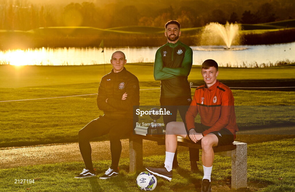 22 November 2021; In attendance during the announcement of the PFA Ireland Award Nominees 2021 are, PFA Ireland Player of the Year Nominees from left, Georgie Kelly of Bohemians, Roberto Lopes of Shamrock Rovers, and Chris Forrester of St Patrick's Athletic, at Castleknock Golf Club in Dublin. Photo by Sam Barnes/Sportsfile