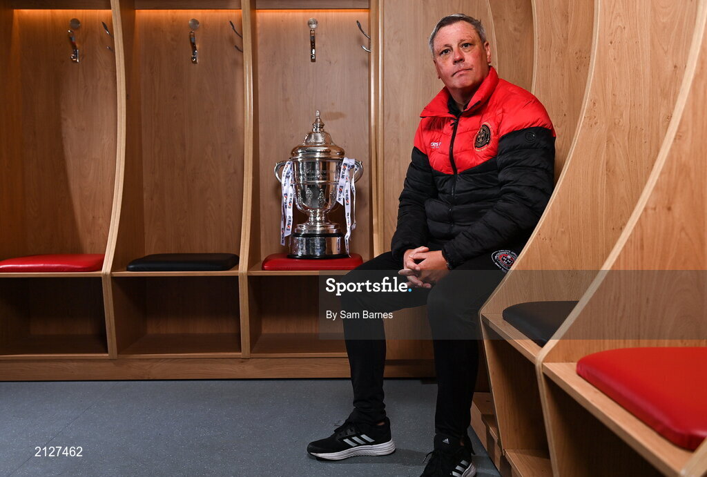 23 November 2021; Bohemians manager Keith Long sits for a portrait during the Bohemians FAI Cup Final Media Day at DCU Sports Campus in Dublin. Photo by Sam Barnes/Sportsfile