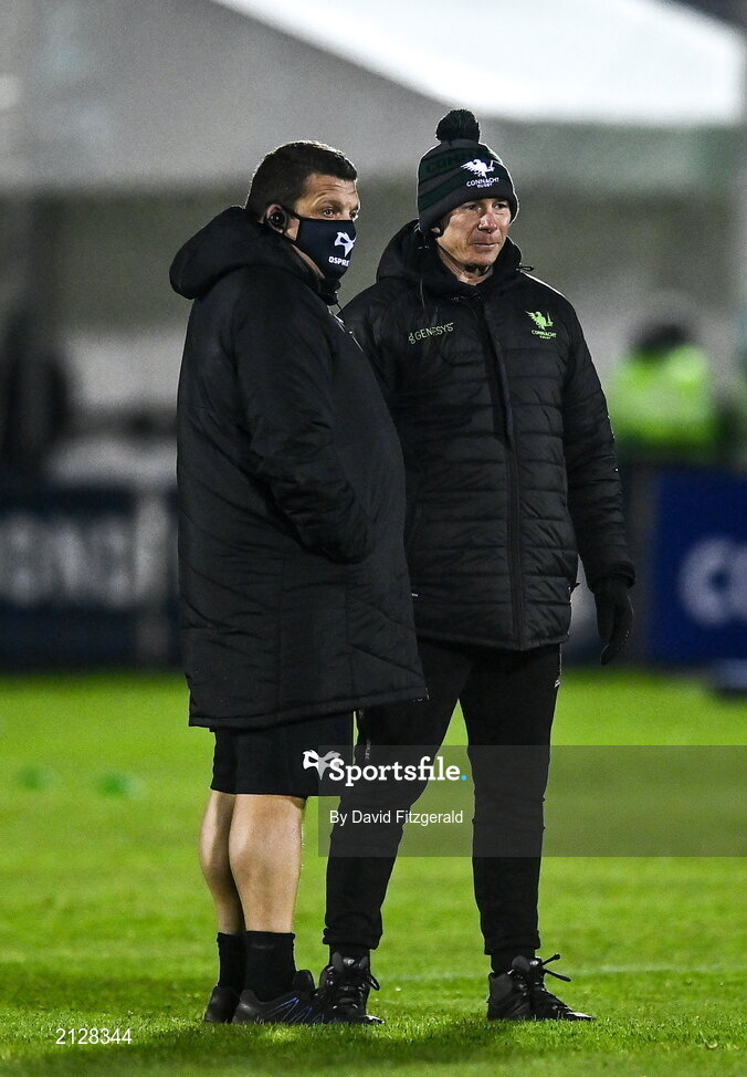 26 November 2021; Ospreys head coach Toby Booth, left, and Connacht head coach Andy Friend before the United Rugby Championship match between Connacht and Ospreys at The Sportsground in Galway. Photo by David Fitzgerald/Sportsfile