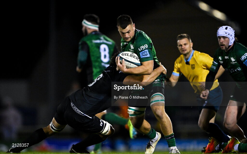 26 November 2021; Conor Oliver of Connacht is tackled by Ethan Roots of Ospreys during the United Rugby Championship match between Connacht and Ospreys at The Sportsground in Galway. Photo by Piaras Ó Mídheach/Sportsfile