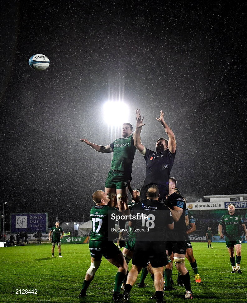 26 November 2021; Oisín Dowling of Connacht wins possession from a line-out ahead of Jack Regan of Ospreys during the United Rugby Championship match between Connacht and Ospreys at The Sportsground in Galway. Photo by David Fitzgerald/Sportsfile