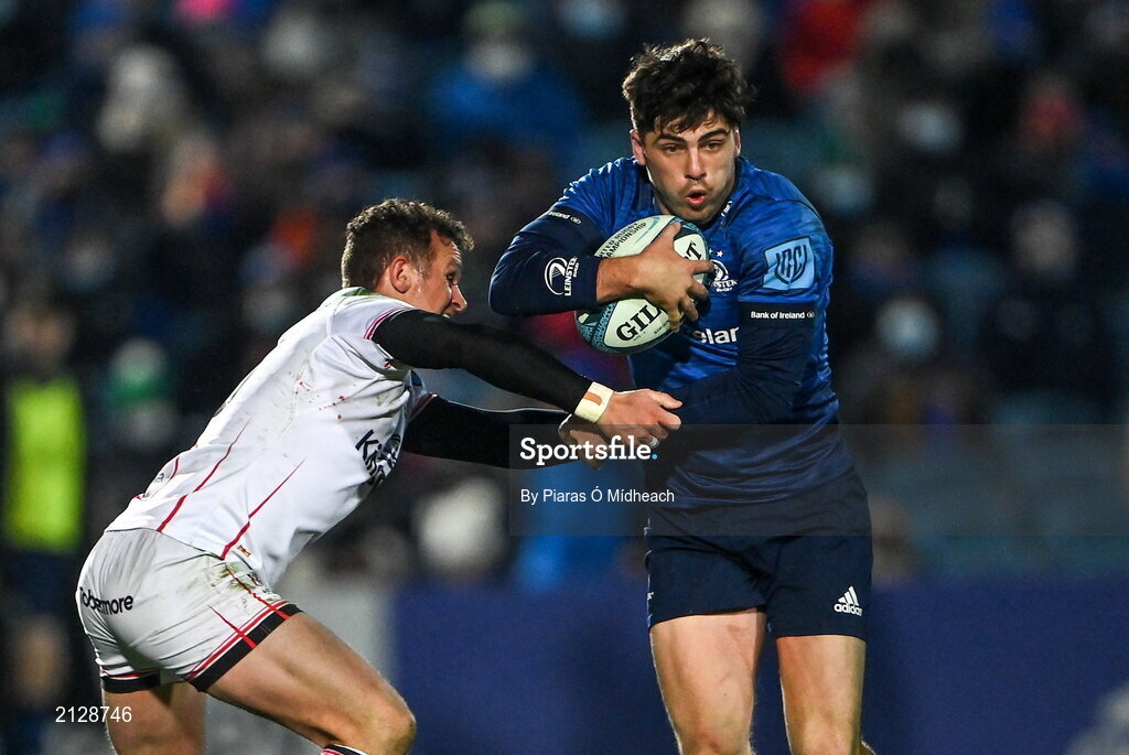 27 November 2021; Jimmy O'Brien of Leinster is tackled by Billy Burns of Ulster during the United Rugby Championship match between Leinster and Ulster at RDS Arena in Dublin. Photo by Piaras Ó Mídheach/Sportsfile