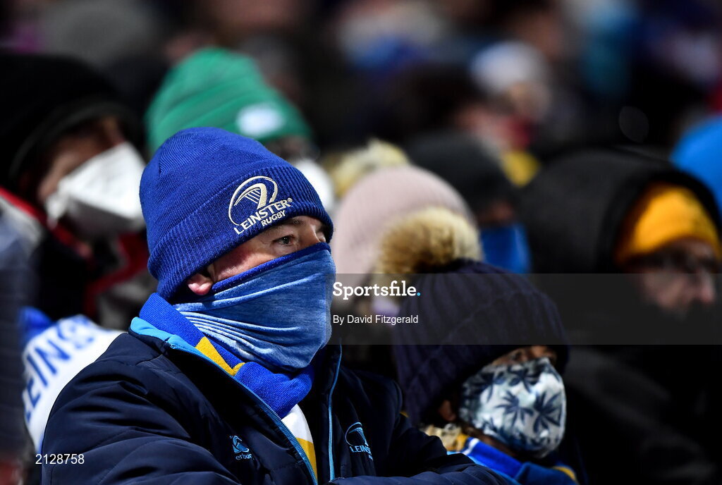 27 November 2021; Leinster supporters during the United Rugby Championship match between Leinster and Ulster at RDS Arena in Dublin. Photo by David Fitzgerald/Sportsfile