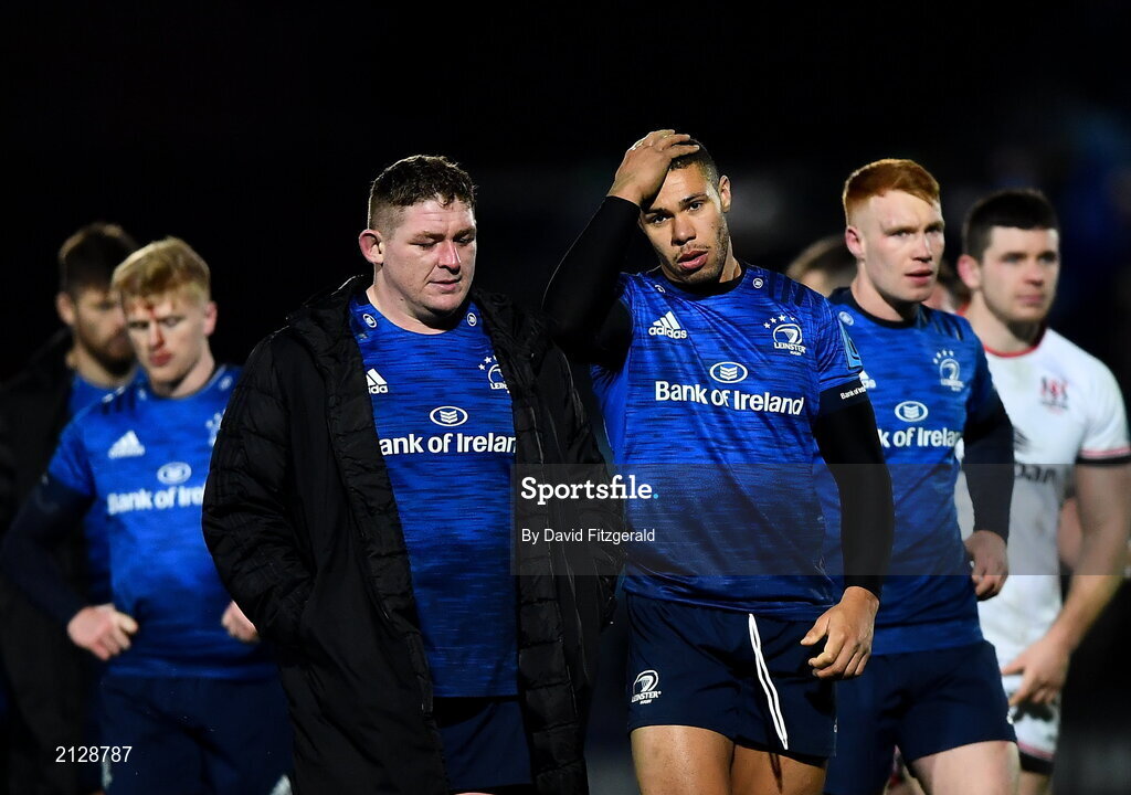 27 November 2021; Tadhg Furlong, left, and Adam Byrne of Leinster after their side's defeat in the United Rugby Championship match between Leinster and Ulster at RDS Arena in Dublin. Photo by David Fitzgerald/Sportsfile