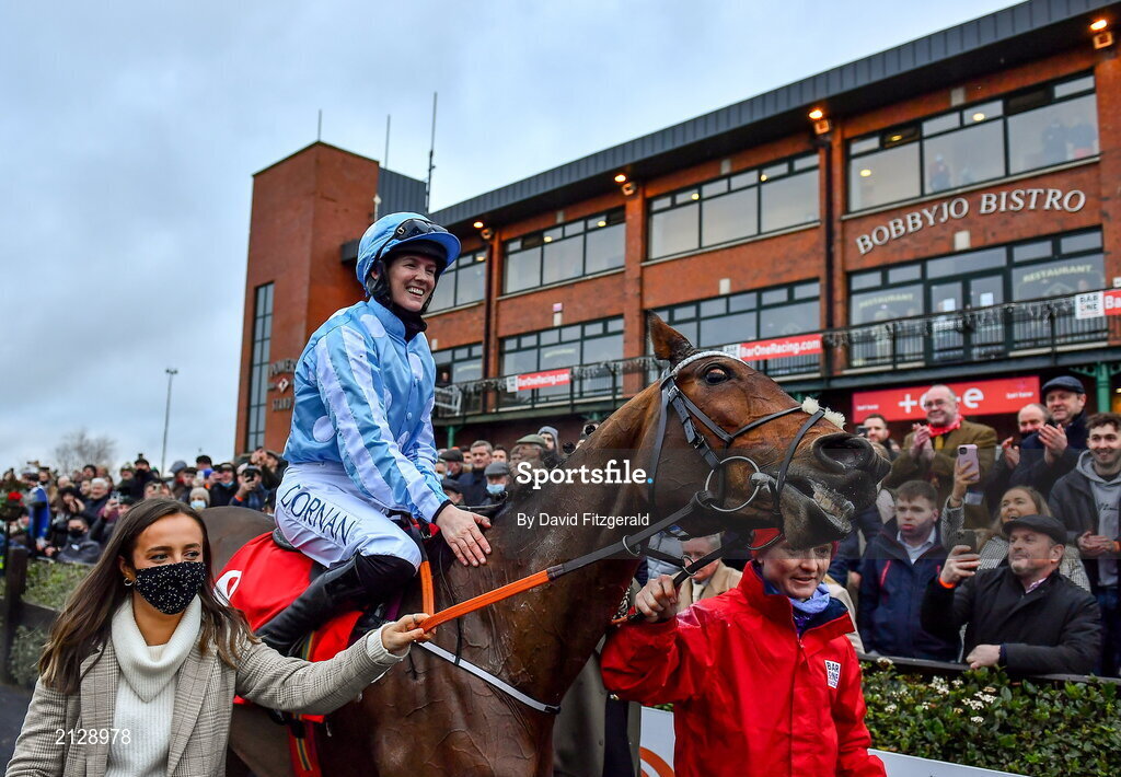 28 November 2021; Rachael Blackmore celebrates on Honeysuckle as they return to the parade ring after winning the BARONERACING.COM Hatton's Grace Hurdle on day two of the Fairyhouse Winter Festival at Fairyhouse Racecourse in Ratoath, Meath. Photo by David Fitzgerald/Sportsfile