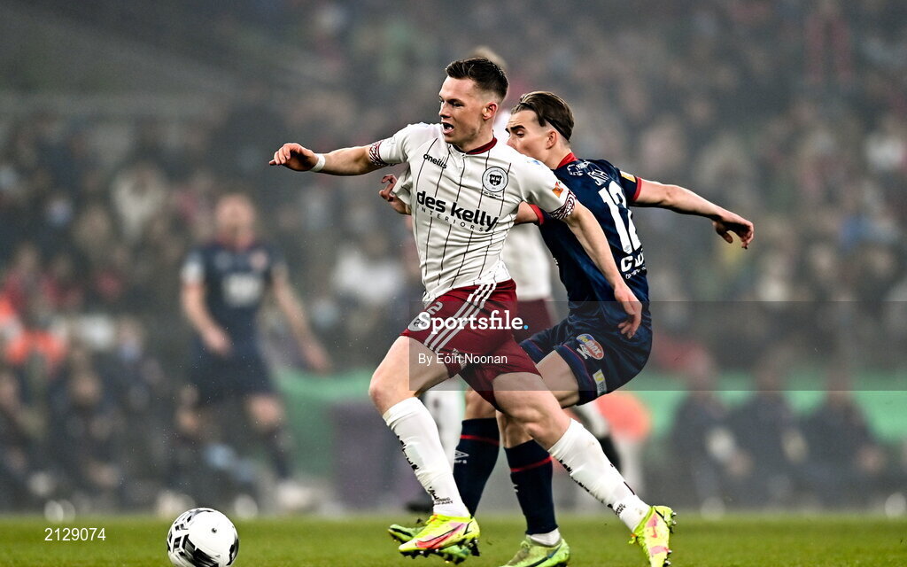 28 November 2021; Andy Lyons of Bohemians in action against Matty Smith of St Patrick's Athletic during the Extra.ie FAI Cup Final match between Bohemians and St Patrick's Athletic at Aviva Stadium in Dublin. Photo by Eóin Noonan/Sportsfile