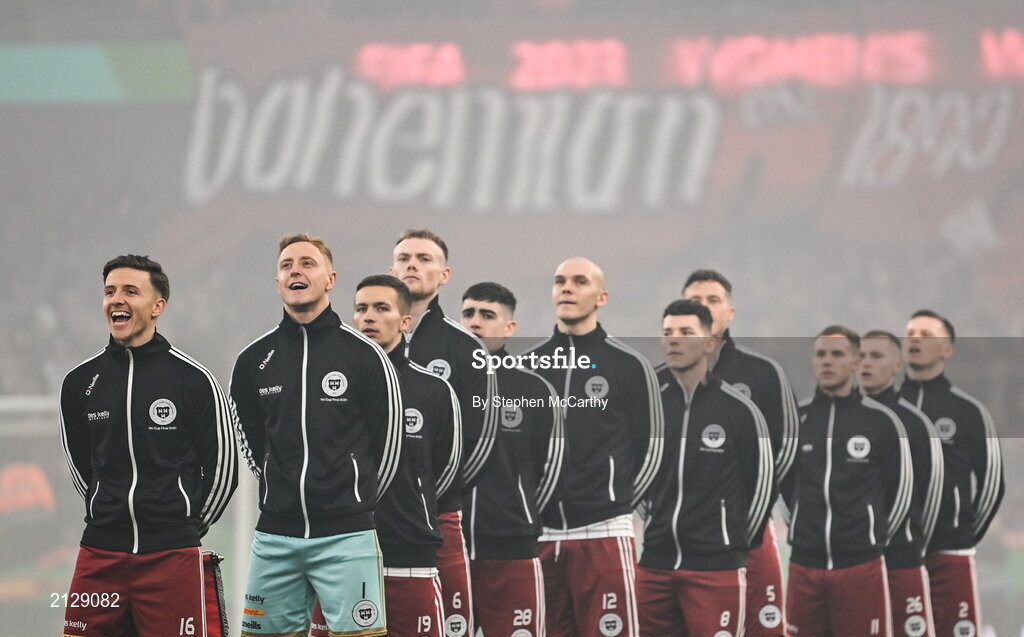 28 November 2021; Bohemians captain Keith Buckley and his teammates during the National Anthem before the Extra.ie FAI Cup Final match between Bohemians and St Patrick's Athletic at Aviva Stadium in Dublin. Photo by Stephen McCarthy/Sportsfile