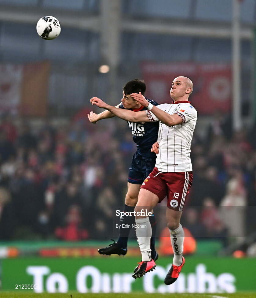 28 November 2021; Georgie Kelly of Bohemians and Lee Desmond of St Patrick's Athletic during the Extra.ie FAI Cup Final match between Bohemians and St Patrick's Athletic at Aviva Stadium in Dublin. Photo by Eóin Noonan/Sportsfile