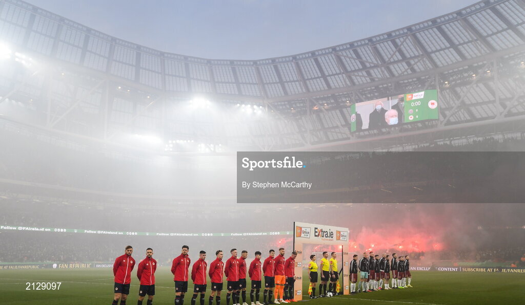 28 November 2021; Both teams line-up for the National Anthem before the Extra.ie FAI Cup Final match between Bohemians and St Patrick's Athletic at the Aviva Stadium in Dublin. Photo by Stephen McCarthy/Sportsfile